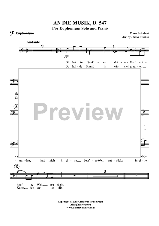 Digital Sheet Music for An Die Musik, D. 547 - Euphonium BC/TC by Franz Schubert, David Werden scored for Euphonium/Piano; id:311662