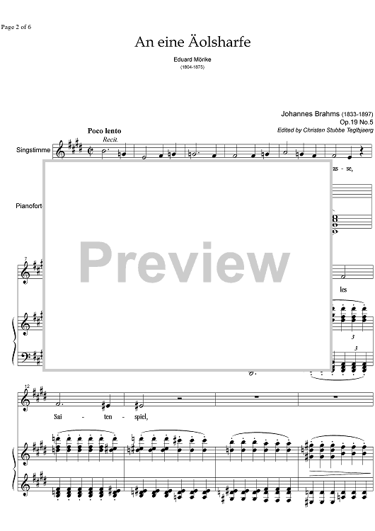 "An eine Äolsharfe Op.19 No. 5" Sheet Music by Johannes Brahms