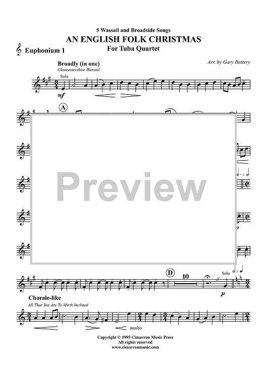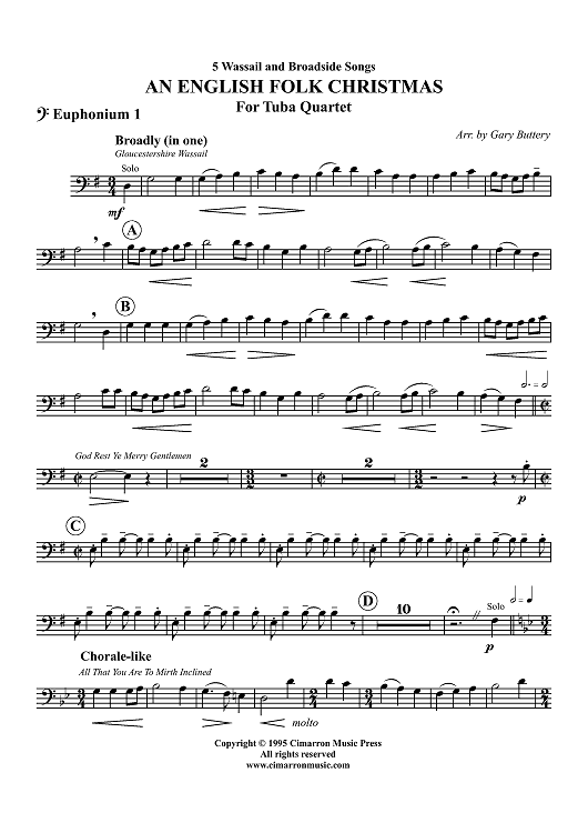 Digital Sheet Music for An English Folk Christmas - Euphonium 1 BC/TC by Gary Buttery scored for Tuba Quartet; id:315311