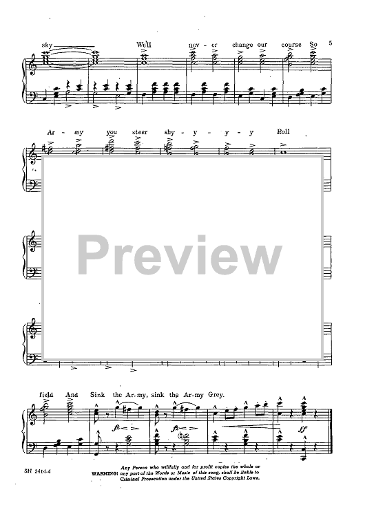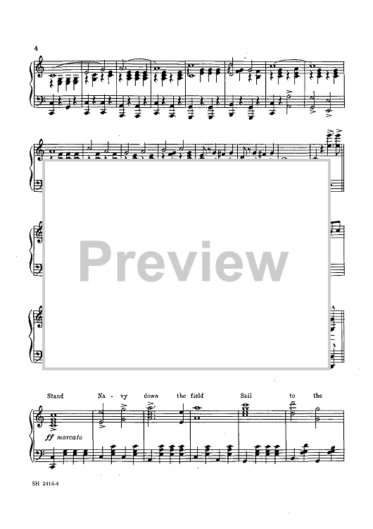 "Anchors Aweigh" is the fight song of the United States Naval Academy. It was composed by Charles A. Zimmerman with lyrics by Alfred Hart Miles. At the time, Zimmerman was a Lieutenant and had been bandmaster of the United States Naval Academy Band since 1887. Miles was Midshipman First Class at the Academy, in the class of 1907, and asked Zimmerman to assist him in composing a song for that class, to be used as a football march. Presented here is the complete sheet music of the original “Two-Step March” … the Trio of the piece is what most people commonly know as the fight song.