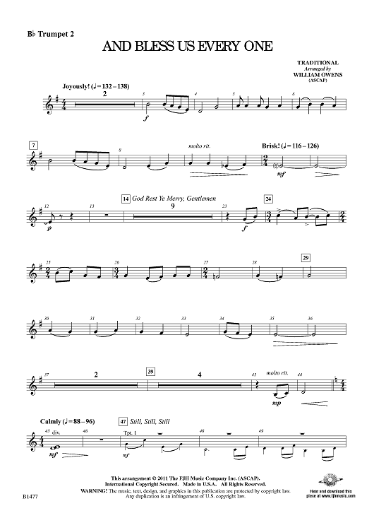 Digital Sheet Music for And Bless Us Every One - Bb Trumpet 2 by Traditional, William Owens scored for Concert Band; id:425872