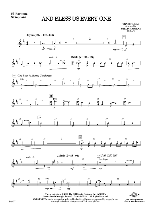 Digital Sheet Music for And Bless Us Every One - Eb Baritone Sax by Traditional, William Owens scored for Concert Band; id:425870