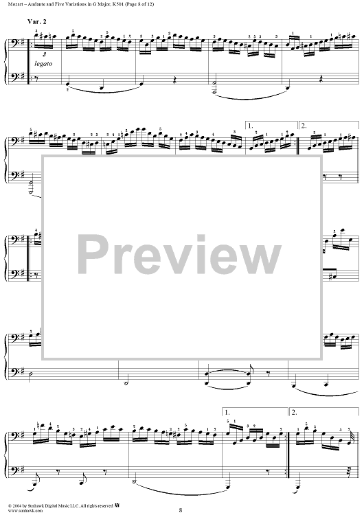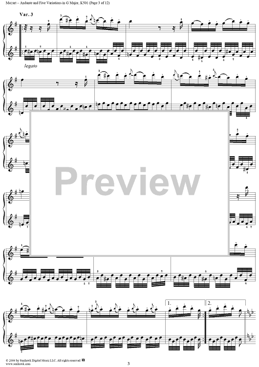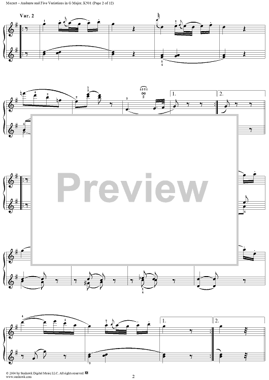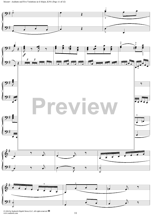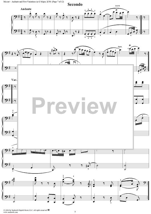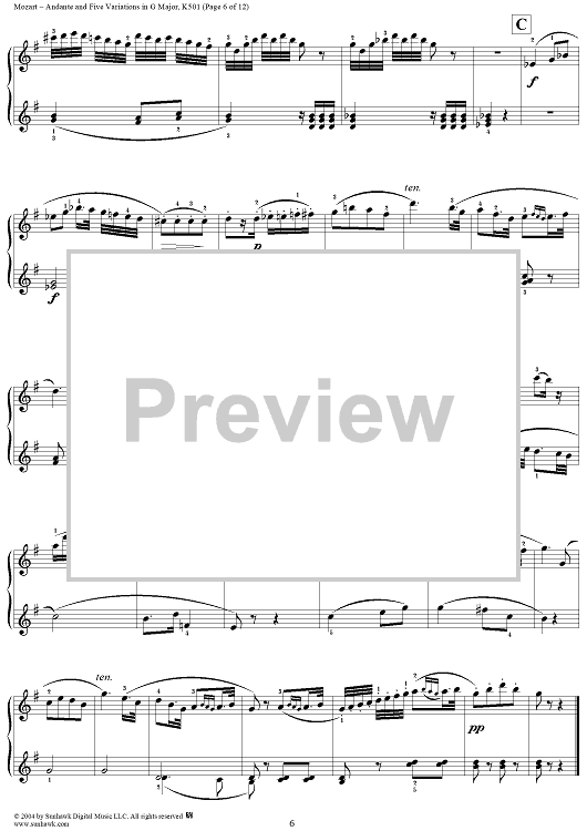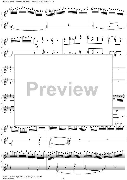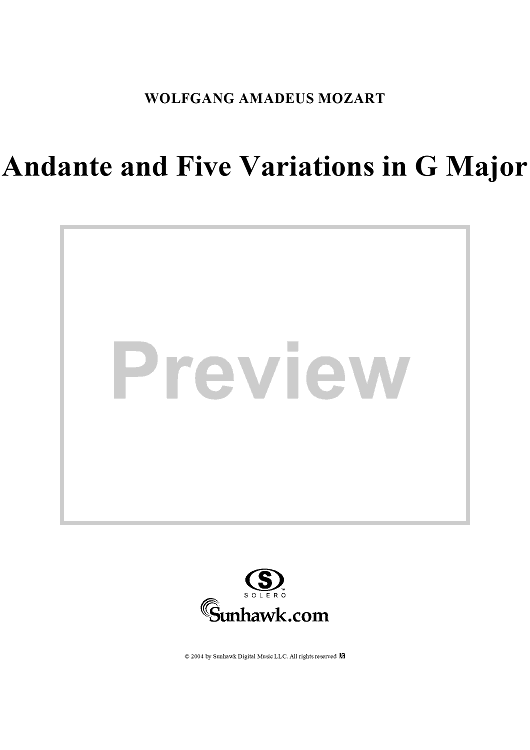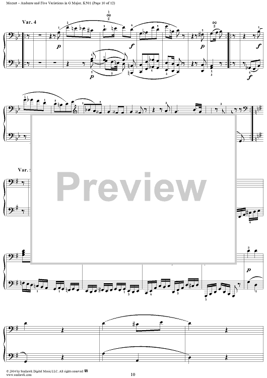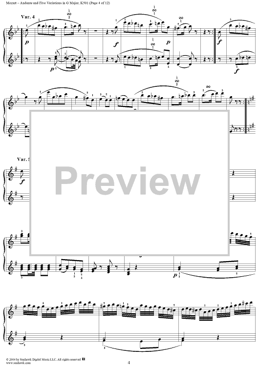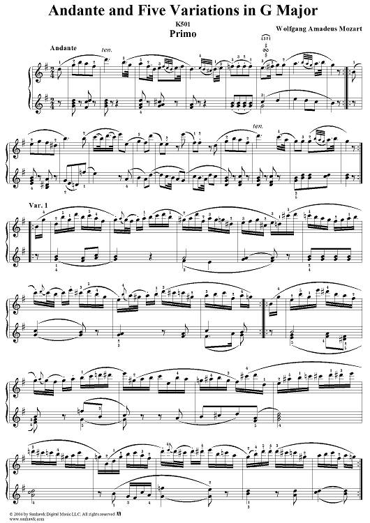Digital Sheet Music for Andante and 5 Variations in G Major, K501 by Wolfgang Amadeus Mozart scored for 1 Piano, 4 Hands; id:294584