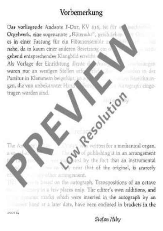 Das Andante F-Dur, KV 616, ist für ein mechanisches Orgelwerk, eine sogenannte "Flötenuhr", geschrieben. Der Gedanke, es in einer Fassung für ein Flötenensemble zu veröffentlichen, lag nahe, da in kaum einer anderen Besetzung ein dem Original so weitgehend entsprechendes Klangbild erreicht wird.