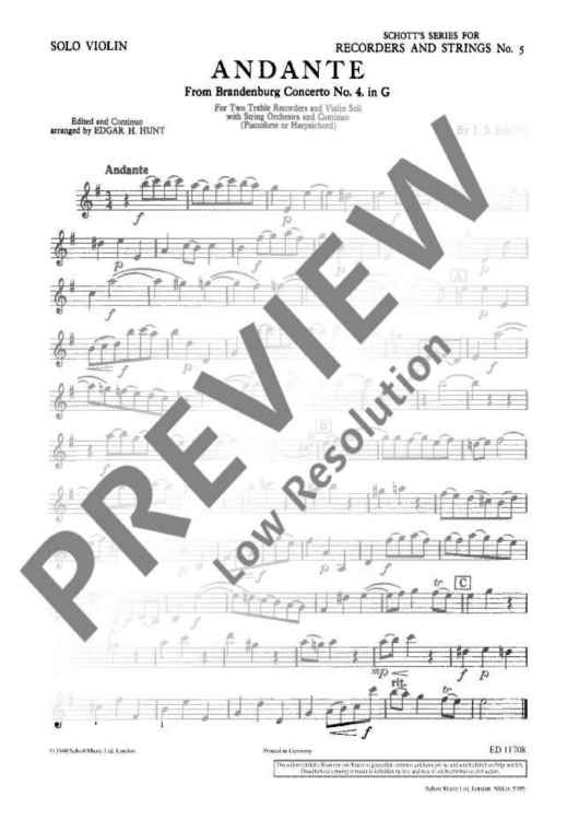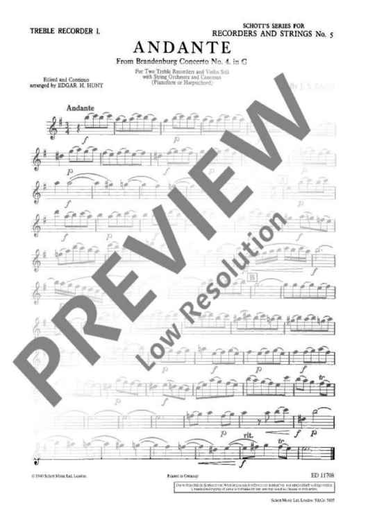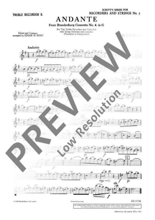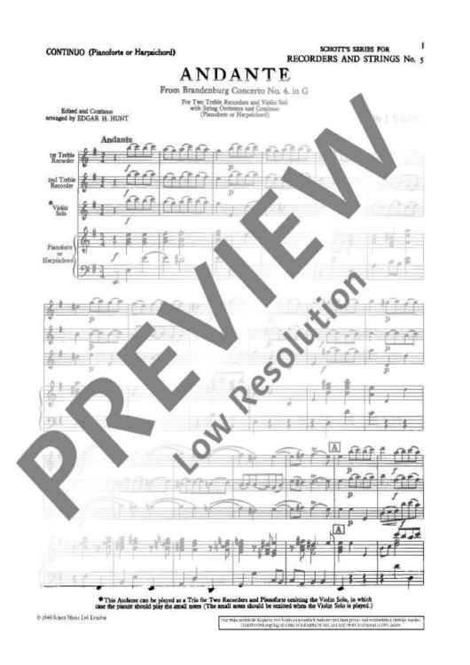 Digital Sheet Music for Andante in G major - Piano Score and Solo Part by Johann Sebastian Bach scored for 2 Treble Recorders, Violin, String Orchestra And Basso Continuo; id:474468
