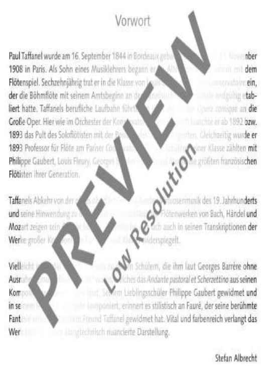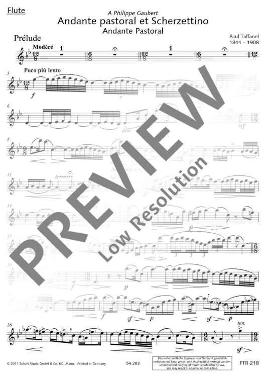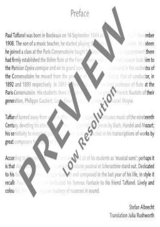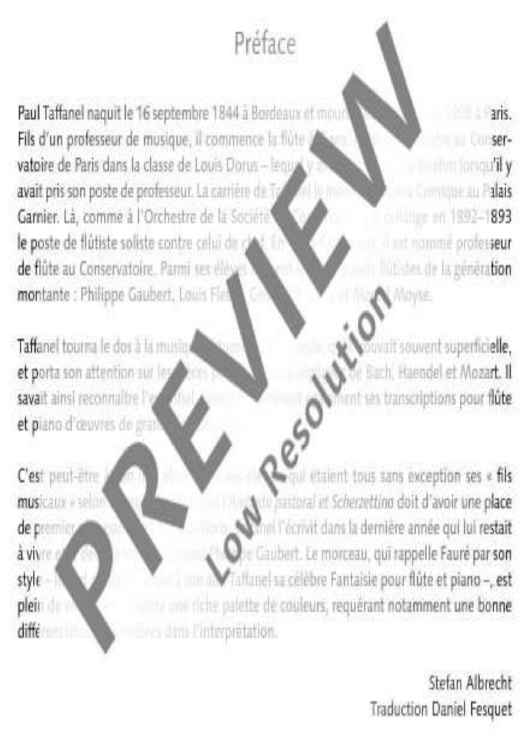 Paul Taffanel (born in Bordeaux on 16 September 1844, died in Paris on 21 November 1908) was solo flutist at the Paris Opéra comique and professor of flute at the Paris Conservatoire. Among the pupils of his class were Philippe Gaubert and Marcel Moyse, the greatest French flutists of their generation. It was perhaps the close relationship to his pupils who, according to Georges Barrère, were to him, without exception, 'musical sons', which makes Andante pastoral et Scherzettino stand out among his compositions. Dedicated to his favourite pupil Philippe Gaubert and composed in the last year of his life, its style is reminiscent of Fauré who for his part dedicated his famous Fantasia to his friend Taffanel. Energetic and richly colourful, the work demands a subtle interpretation, especially with regard to sound and technique.