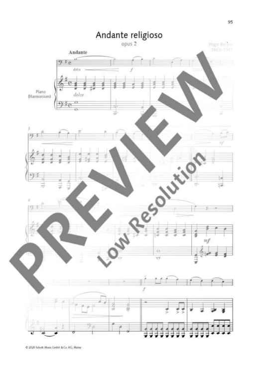 Hugo Becker was a notable cellist and teacher: born in Strasbourg on 13.2.1863, he died in Geiselgasteig near Munich on 30.7.1941. He started cello lessons with his father Jean Becker and was later taught by A. Piatti, J. de Swert and F. Grützmacher. Becker was initially employed as a cellist at the Mannheim National Theatre and then as principal cellist in the opera orchestra in Frankfurt am Main (1884–1886). From 1887–1906 he taught cello at the Hoch Conservatoire in Frankfurt, from 1909–1929 as a professor at the Academy of Music in Berlin. His book on the Mechanics and Aesthetics of Playing the Cello (Berlin 1929) deals with the physiological principles of cello playing and is still worth reading today. Schott published Becker’s Cello Concerto in A major op. 10 as well as some short character pieces. Andante religioso op. 2 is in three sections (A-B-A) with a lyrical A section and a faster rhythmic middle section. It was published by Schott in 1887 as plate number 24419.