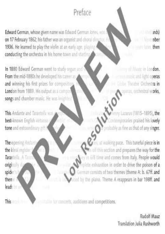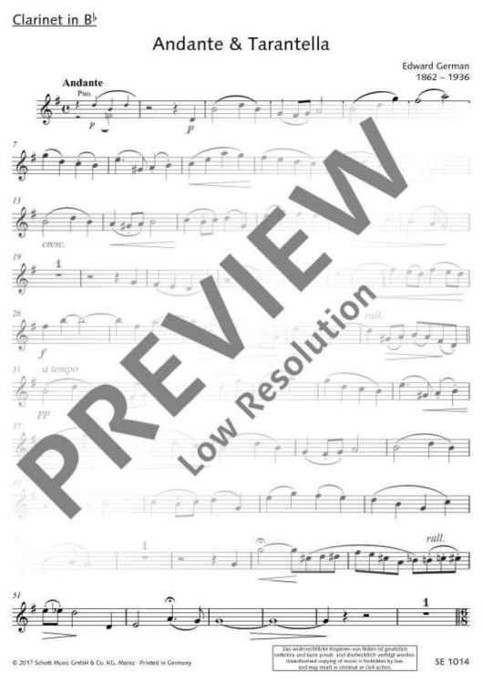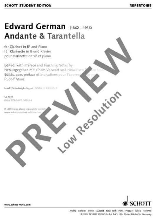 Andante & Tarantella was composed by Sir Edward German in 1892. This melodious piece is written in the most suitable position for clarinet and is aimed at moderately advanced players. The quiet andante section is followed by a little cadenza which opens the piece towards the tarantella. The piece is perfect for competitions or concerts – and also as an original encore. This edition is part of the new Schott Student Edition series which offers varied literature at five different levels of difficulty and provides practising tips and information by the editor Rudolf Mauz (Die fröhliche Klarinette).