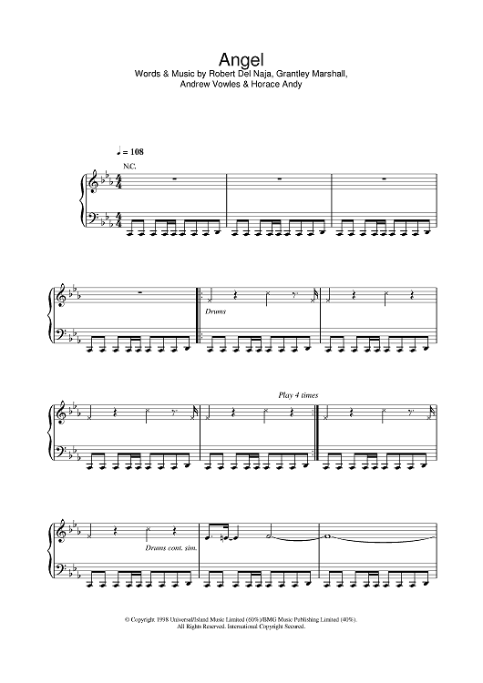 Digital Sheet Music for Angel by Grantley Marshall, Massive Attack, Robert Del Naja, Andrew Vowles, Horace Andy scored for Piano/Vocal/Chords; id:378029