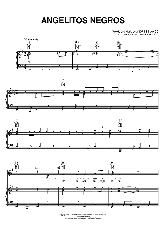 Digital Sheet Music for Angelitos Negros by Celia Cruz, Andres Blanco, Manuel Alvarez Maciste scored for Piano/Vocal/Chords; id:386295
