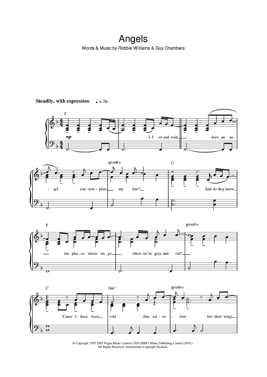 Digital Sheet Music for Angels by Robbie Williams, Guy Chambers scored for Piano/Vocal/Chords; id:394912