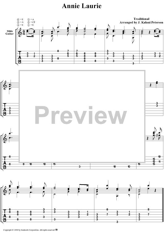 Digital Sheet Music for Annie Laurie by J. Kalani Peterson, Traditional scored for Guitar Tab; id:95677