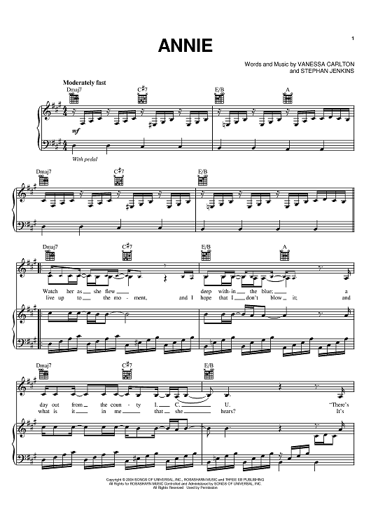 "Annie" Sheet Music by Vanessa Carlton