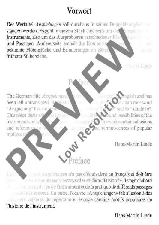 Durch die Wiederentdeckung der alten Musik und die Interpretation mit Originalinstrumenten erfreut sich auch die barocke Traversflöte einer zunehmenden Beliebtheit. Hans-Martin Linde (* 1930), einer der profiliertesten Traverso-Spieler, nutzt den besonderen klanglichen Reiz der Traversflöte erstmals für eine Komposition in der Sprache unserer Zeit. Linde versteht den Titel in einem doppeldeutigen Sinn: Es geht in diesem Stück einerseits um das „Anspielen“ des Instrumentes, also um das Ausprobieren verschiedener Klangmöglichkeiten und Passagen. Andererseits enthält die Komposition „Anspielungen“ auf bekannte Flötenstücke und Erinnerungen an gängige flötistische Figuren früherer Stilbereiche.