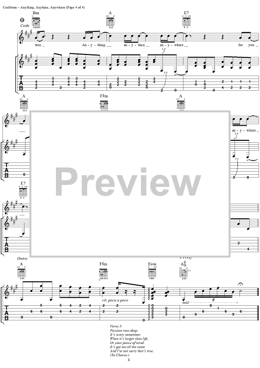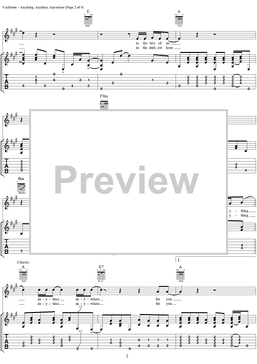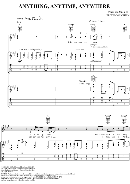 Digital Sheet Music for Anything, Anytime, Anywhere by Bruce Cockburn scored for Guitar Tab/Vocal; id:292081