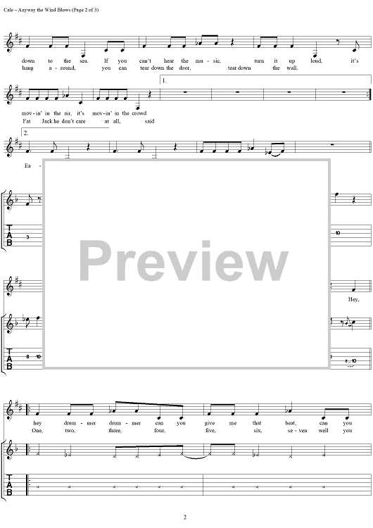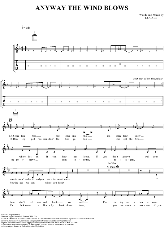 Digital Sheet Music for Anyway The Wind Blows by J. J. Cale scored for Guitar Tab/Vocal; id:273576