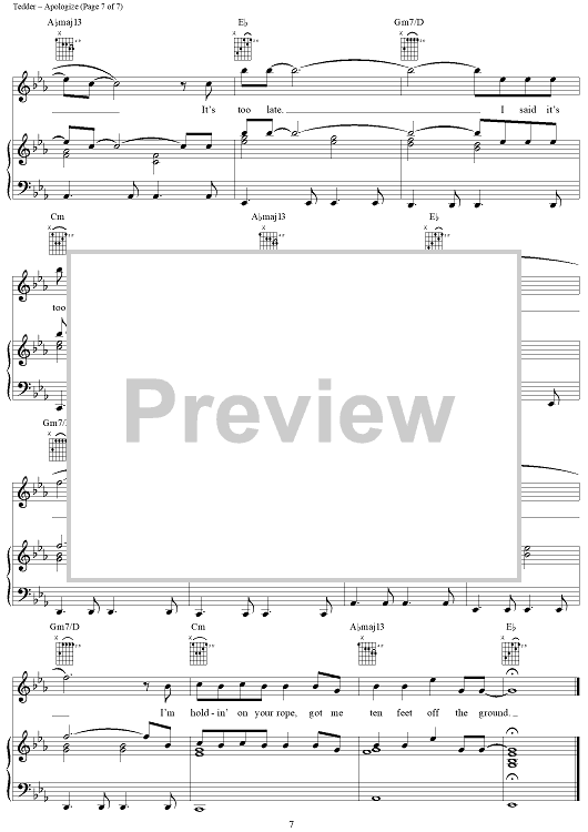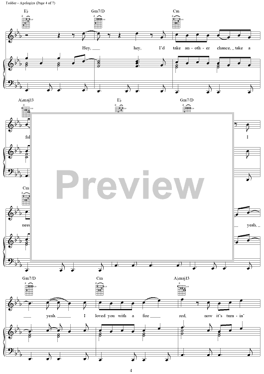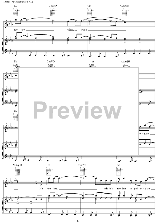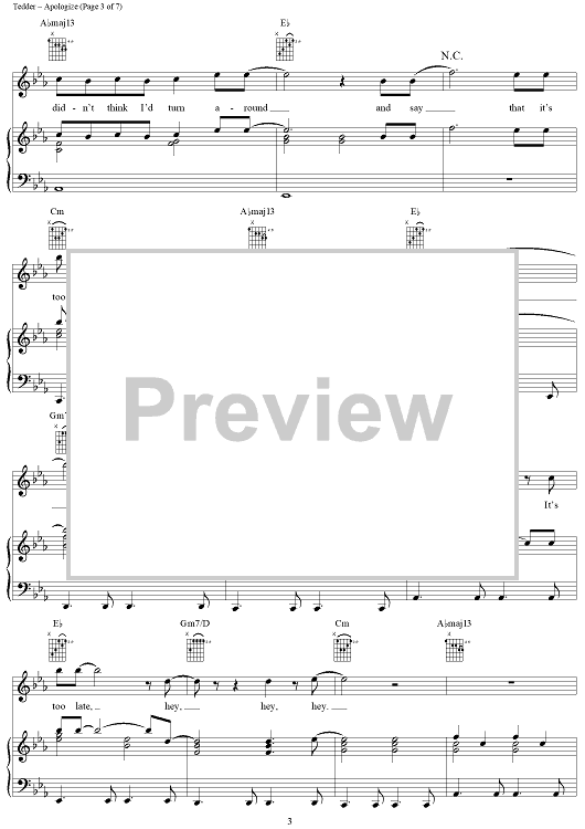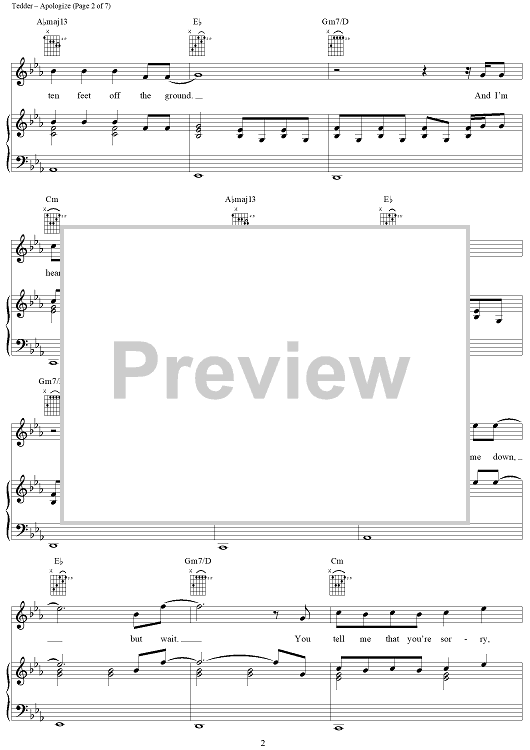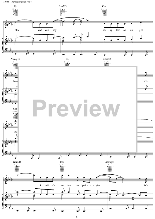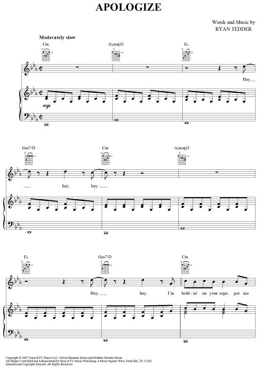 Digital Sheet Music for Apologize by Timbaland, Ryan Tedder, OneRepublic scored for Piano/Vocal/Chords; id:365366