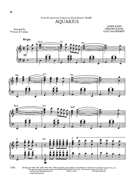 Digital Sheet Music for Aquarius by Galt MacDermot, James Rado, Gerome Ragni, Ferrante & Teicher scored for Piano/Chords; id:423162