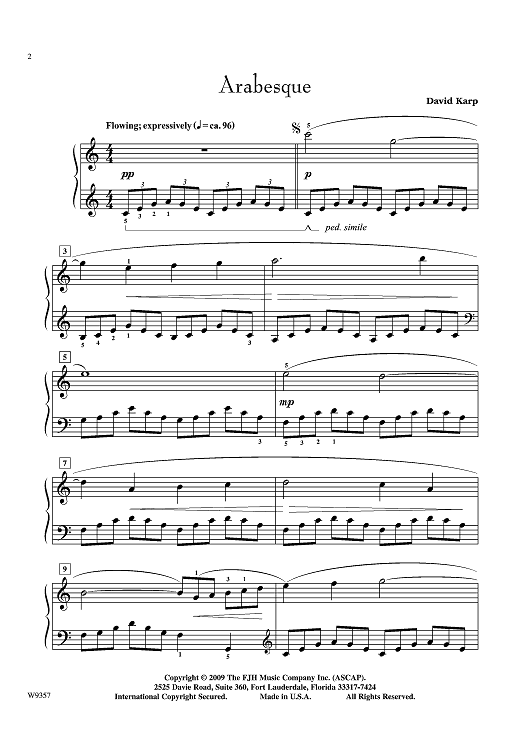 Flowing triplets in the left hand support a lyrical right hand melody in this beautiful piece for the intermediate level student. The triplet accompaniment is easy to coordinate with the melody and produces a shimmering ending in true arabesque style.