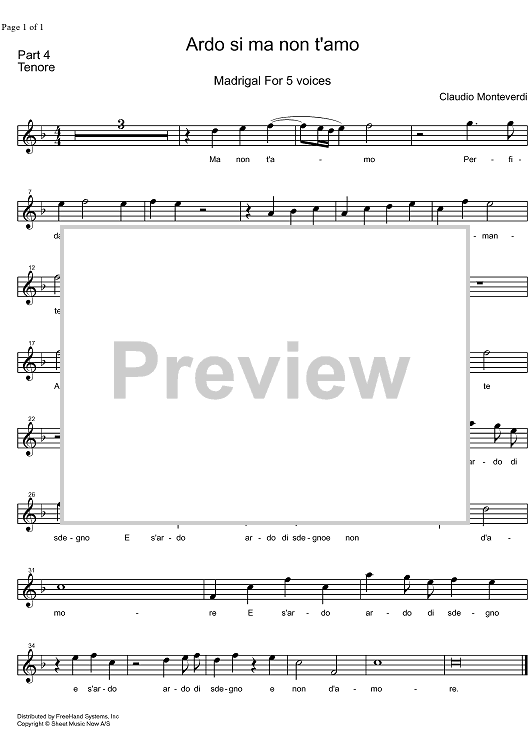 Digital Sheet Music for Ardo si ma non t'amo by Claudio Monteverdi scored for SATB Choir; id:322083