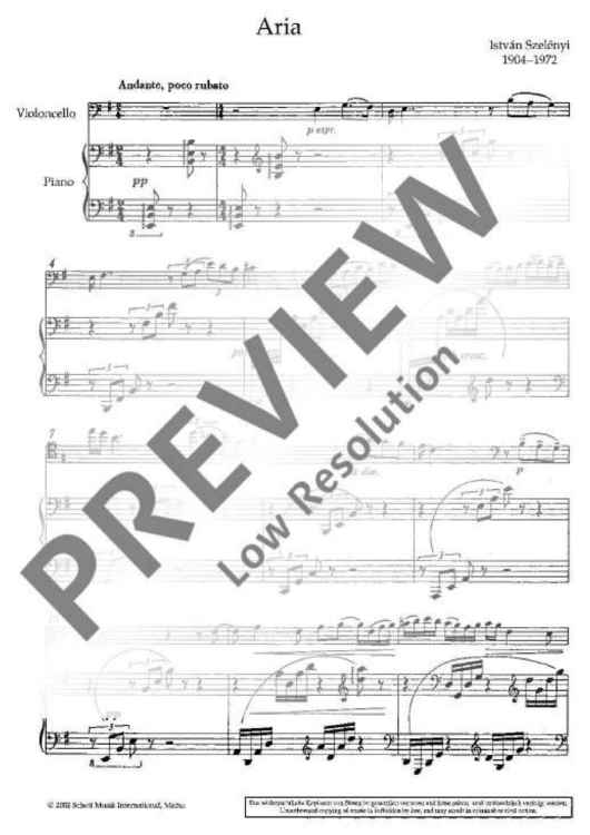 The Hungarian composer István Szelényi (1904 - 1972), a student of Kodály, originally wrote "Aria" for cello or clarinet and piano. Subsequently the solo part has been transcribed for violin (arranged by Susanne Bánk) and viola (arranged by Martin Fischer). The original version, an elegiac, cantabile concert piece - many rhythmic and melodical features are influenced by Kodály and Hungarian folk music - requires a beautiful tone and a freely drawn-out tempos with plenty of rubato from the performer.