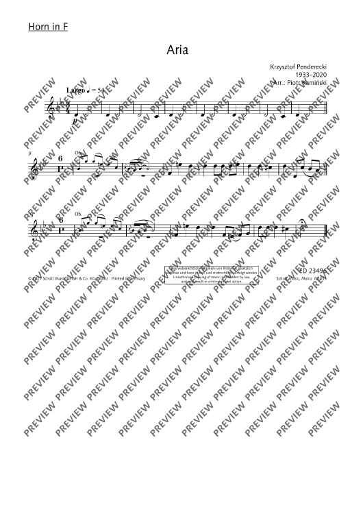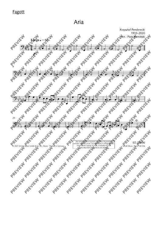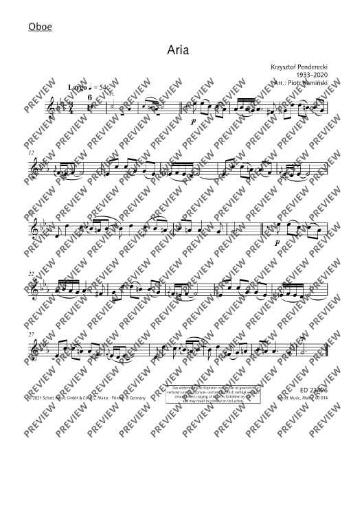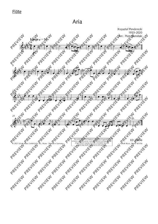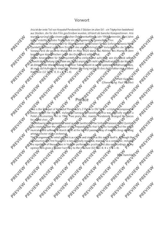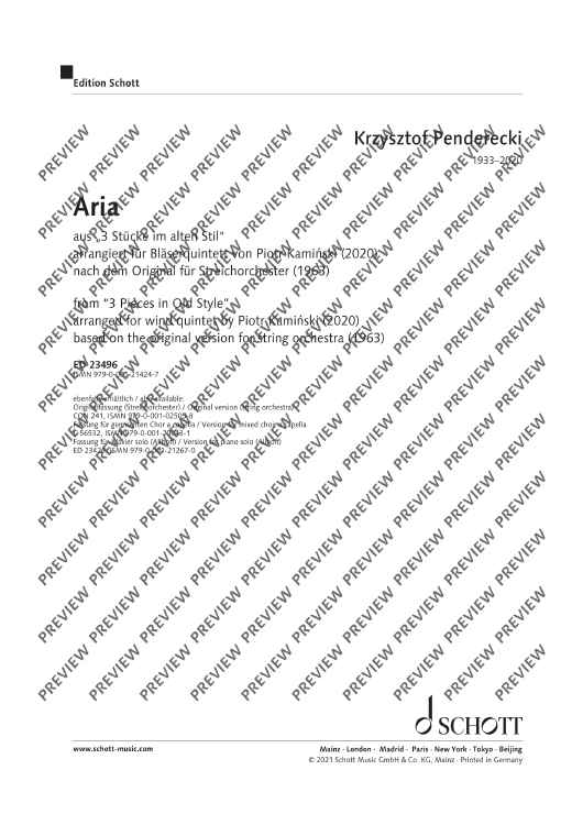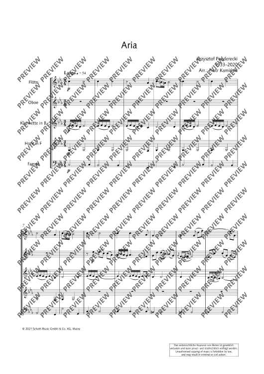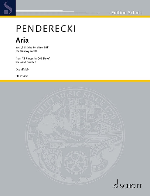 Krzysztof Pendereckis gefühlvolle "Aria" gilt längst als Standardwerk. Die an barocke Ostinati verweisende harmonische Struktur bildet die Grundlage für die arios gestaltete Cantilene. Ursprünglich für Streichorchester komponiert, liegt das Werk nun als Bearbeitung für Bläserquintett vor und bereichert das Repertoire als kurzes Intermezzo im Konzertprogramm.