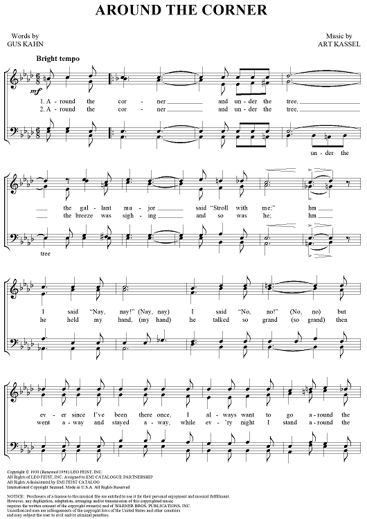 Digital Sheet Music for Around the Corner by Gus Kahn, Art Kassel scored for Barbershop Quartet; id:266353