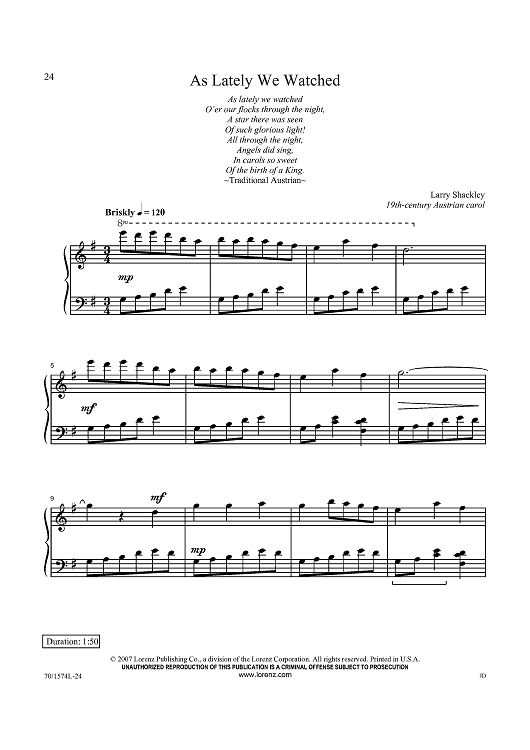 Digital Sheet Music for As Lately We Watched by Larry Shackley, Austrian Carol scored for Piano Solo; id:434545