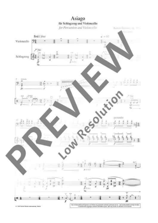 In summer 2001, Bertold Hummel composed the present work as a commission for the "Asiago Festival" and brought together in the grand dimensions of his 'Fantasy in one movement' - as he himself termed it - for the first time the instruments he had always loved much during his life. Asiago - the letters a-s-a-g, corresponding to the notes a, e-flat, a, g in the German musical scale, open and close the work - is a successful excursion into the complex sound combinations of percussion instruments and the mystical, sensuous tone of the violoncello, whereby the stringed instrument occasionally takes on a percussive role and the percussion is sometimes treated like a bowed. Driving rhythms pursue each other, alternating with meditative moments. Chorale fragments lead to a grand cadenza, in which the instrumentalists have the opportunity, following patterns provided, for free improvisation. The première of this work took place on 5th August, 2001 in the Duomo di S. Matteo in Asiago in northern Italy and was in the hands of Peter Sadlo and Julius Berger, who are amongst the most committed exponents of Bertold Hummel's works.
