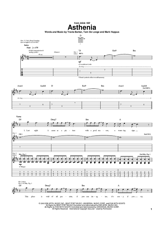 Digital Sheet Music for Asthenia by Travis Barker, Mark Hoppus, blink-182, Tom DeLonge scored for Guitar Tab; id:373350