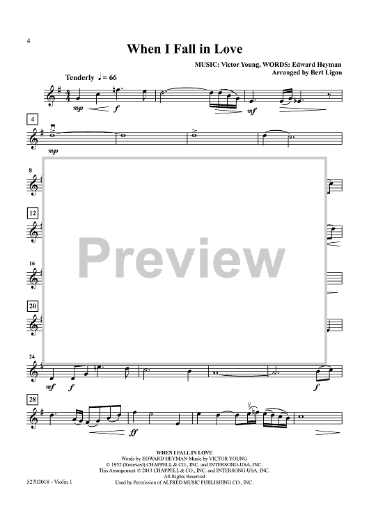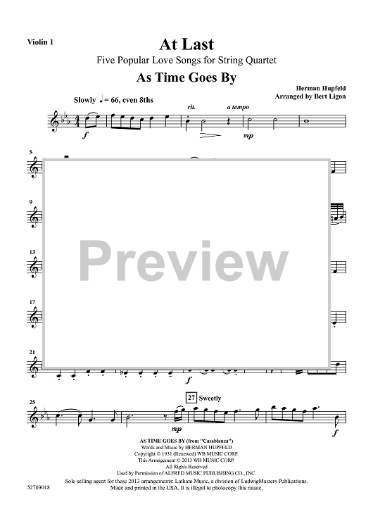 Digital Sheet Music for At Last - Five Popular Love Songs - Violin 1 by Various, Bert Ligon scored for String Quartet; id:458203