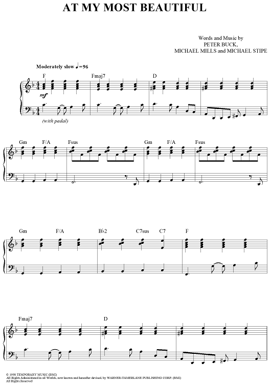 Digital Sheet Music for At My Most Beautiful by R.E.M., Michael Stipe, Peter Buck, Mike Mills scored for Piano/Vocal/Chords; id:433119