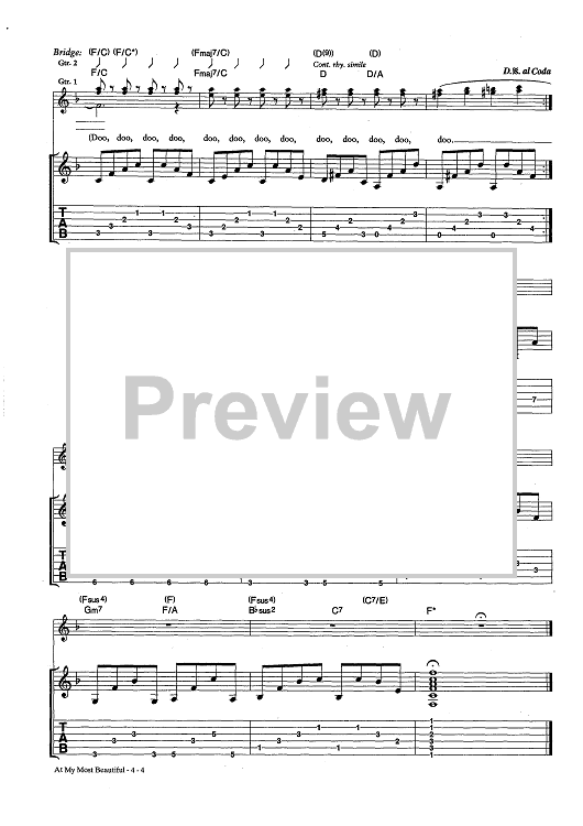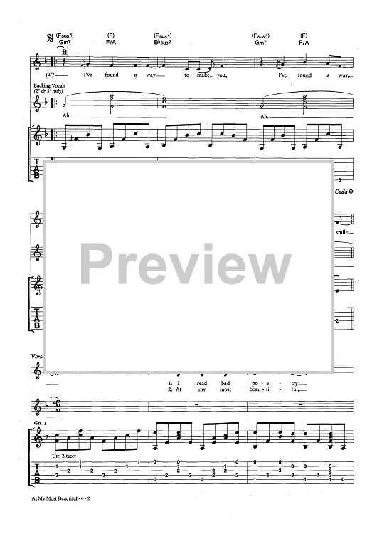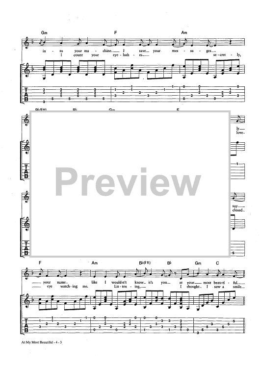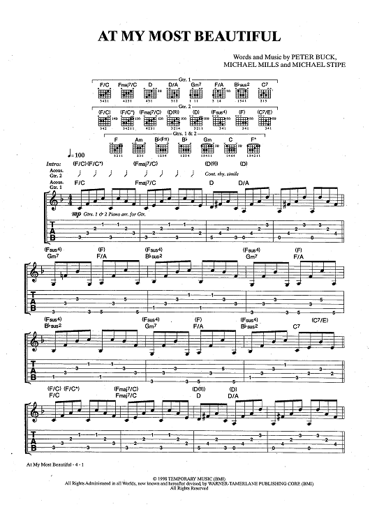 Digital Sheet Music for At My Most Beautiful by R.E.M., Michael Stipe, Peter Buck, Bill Berry scored for Guitar Tab/Vocal/Chords; id:436620
