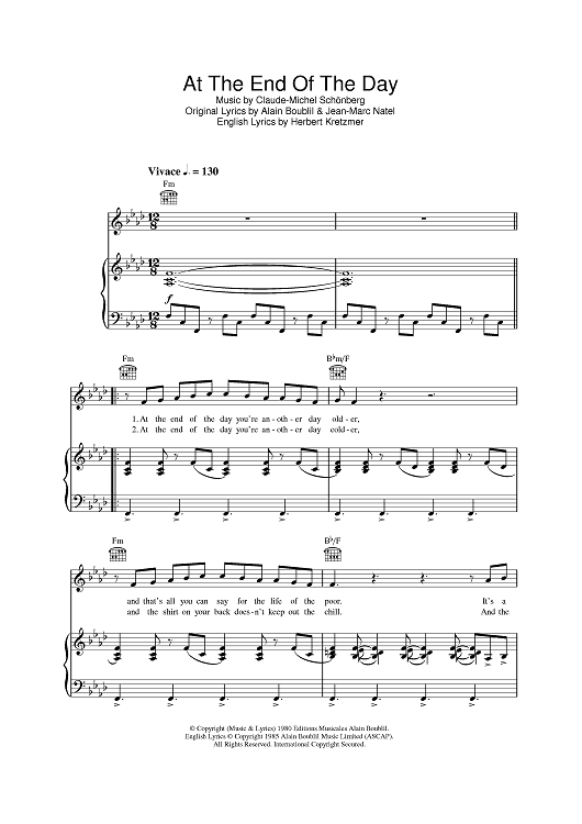 Digital Sheet Music for At The End Of The Day by Claude-Michel Schonberg, Herbert Kretzmer, Alain Boublil, Jean-Marc Natel scored for Piano/Vocal/Chords; id:401437