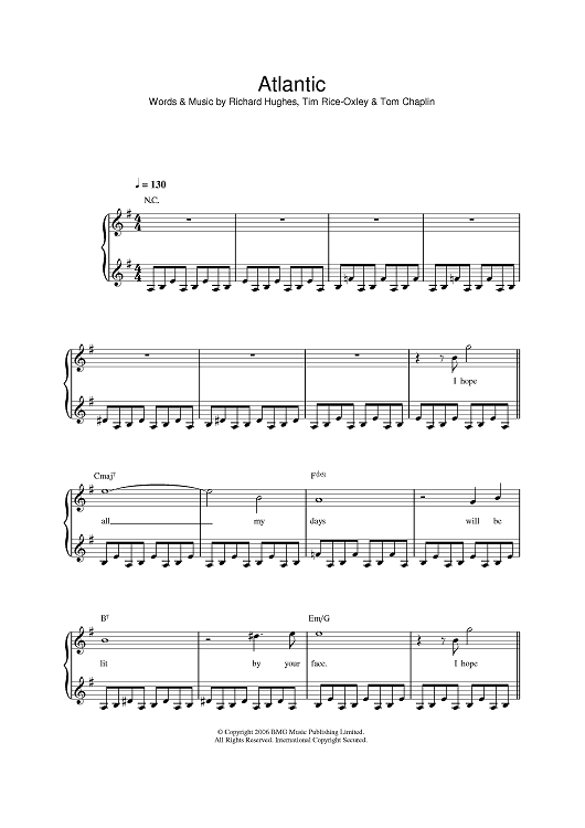 Digital Sheet Music for Atlantic by Keane, Tim Rice-Oxley, Tom Chaplin, Richard David Hughes scored for Piano/Vocal/Chords; id:393198