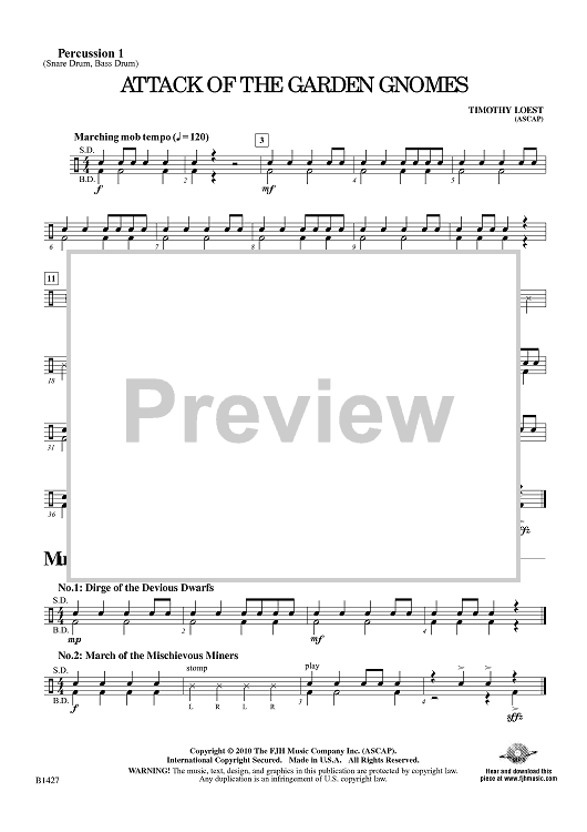 Digital Sheet Music for Attack of the Garden Gnomes - Percussion 1 by Timothy Loest scored for Beginning Band; id:415084