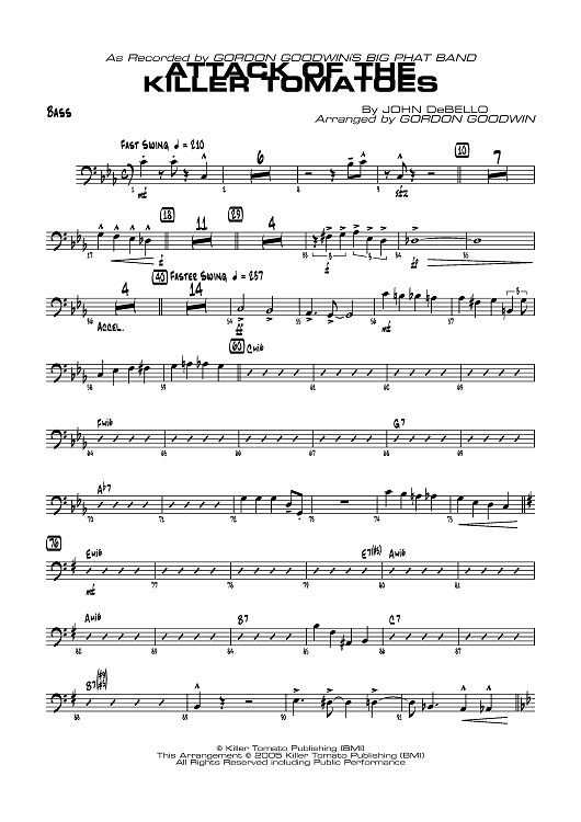Digital Sheet Music for Attack of the Killer Tomatoes - Bass by Gordon Goodwin, Gordon Goodwin's Big Phat Band, John DeBello scored for Jazz Ensemble; id:356137