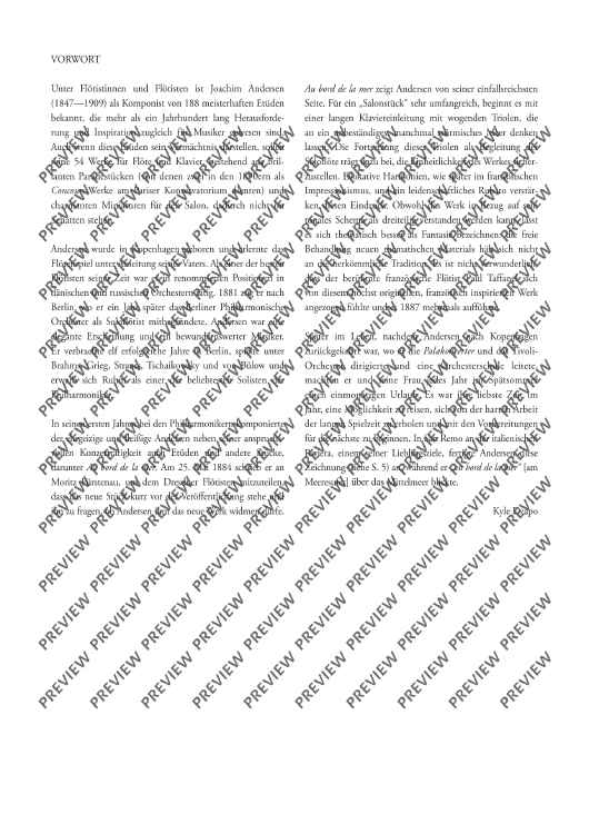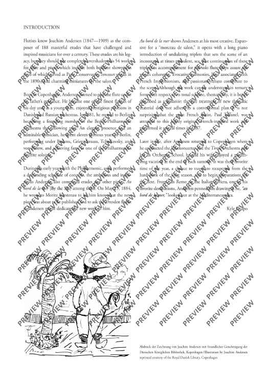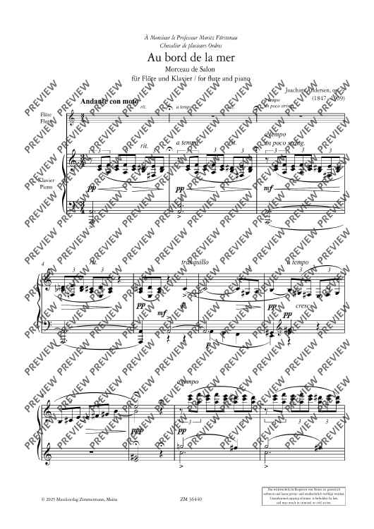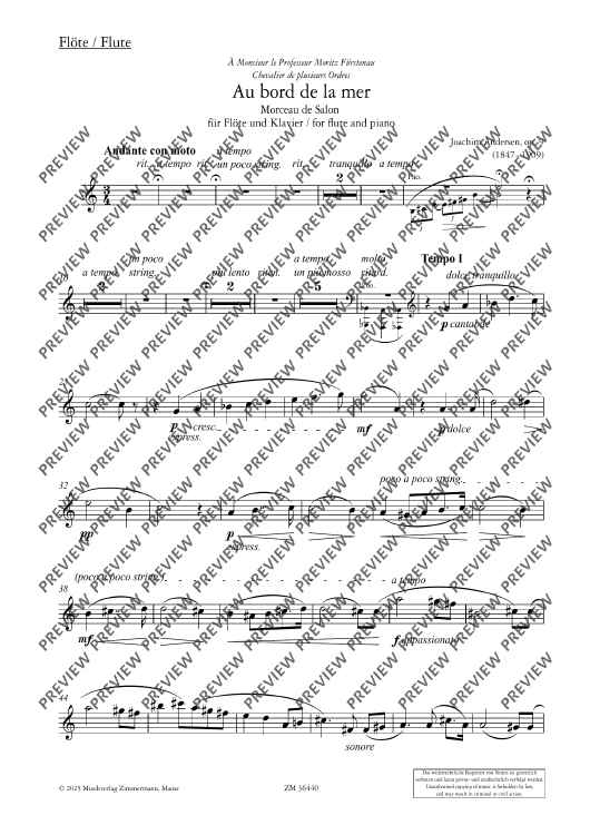 Joachim Andersen, one of the great flute virtuosos of the 19th century, is known to flutists primarily for his etudes, which have become standard repertoire. That he was also able to write very charming salon pieces suitable for both concerts and lessons is proven yet again in his "Au bord de la mer" op. 9. The piece fascinates with its impressionistic style, which evokes the sea.