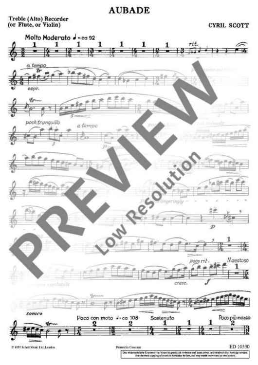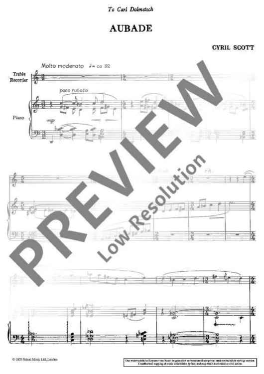 Digital Sheet Music for Aubade by Cyril Scott scored for Treble Recorder (flute, Violin) And Piano; id:487499
