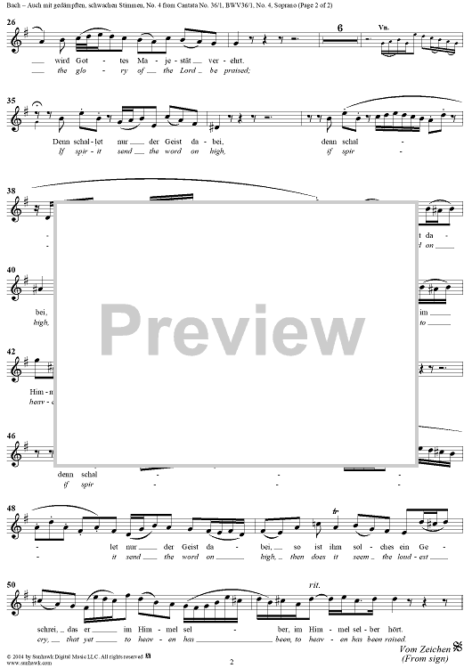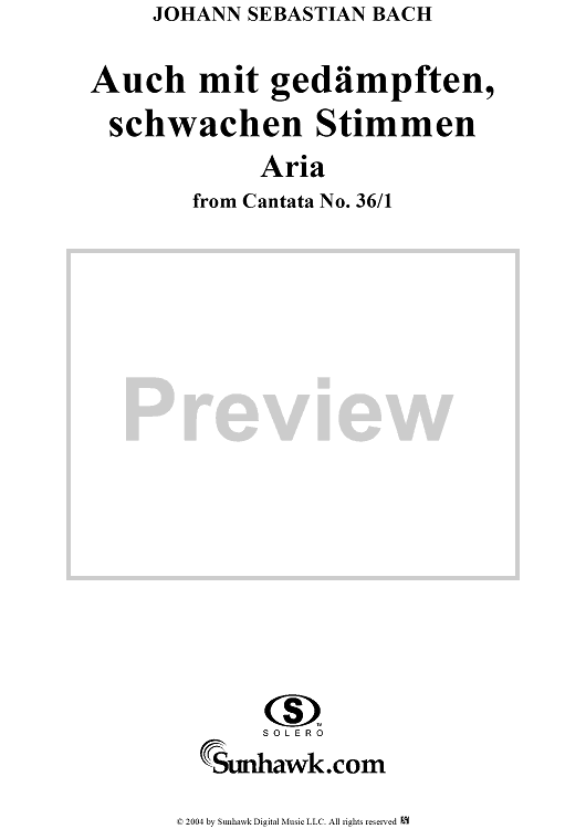 Digital Sheet Music for "Auch mit gedämpften, schwachen Stimmen", Aria, No. 4 from Cantata No. 36/1: "Schwingt freudig euch empor" - Soprano by Johann Sebastian Bach scored for Soprano, Violin and Piano or Organ; id:304499