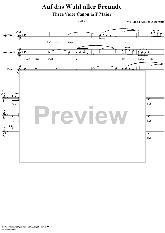 Digital Sheet Music for Auf das Wohl aller Freunde, three voice canon in F Major, K508 by Wolfgang Amadeus Mozart scored for Three-part Mixed Chorus; id:291146