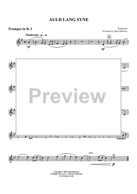 Digital Sheet Music for Auld Lang Syne - Trumpet 2 in B-flat by Nigel Simmons, Traditional scored for Brass Quintet; id:364233