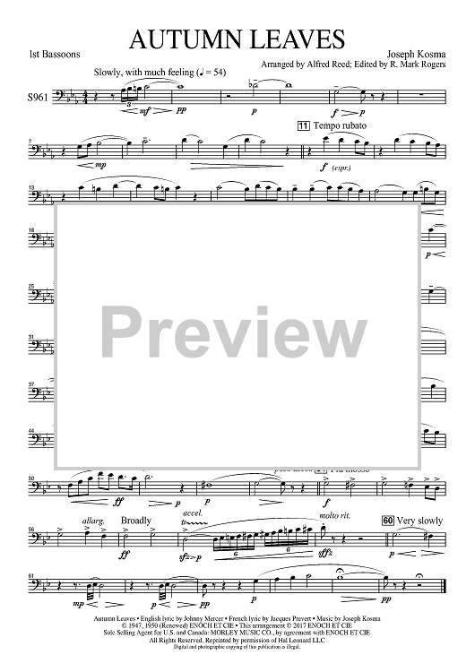 Digital Sheet Music for Autumn Leaves (Les feuilles mortes) - Bassoon 1 by Joseph Kosma, Alfred Reed scored for Concert Band; id:503199