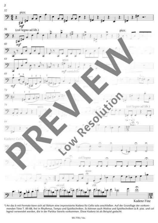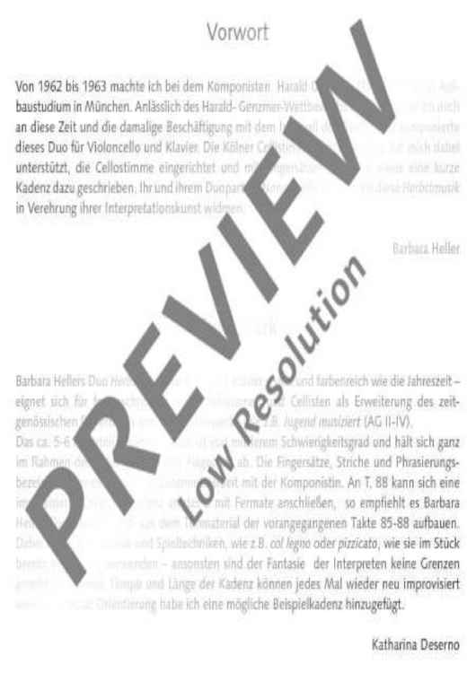 Barbara Heller’s duet 'Herbstmusik' [Autumnal Music] for cello and piano is a short piece of 5-6 minutes' duration which is as vibrant and colourful as the season itself and a welcome addition to the repertoire for this combination of instruments. Graded at intermediate level, it is also a suitable extension to the contemporary repertoire for advanced young cellists and for playing in youth music competitions (age range 11-16). This piece only requires players to use the first four positions plus harmonics. Fingerings and bowings were added in collaboration with the cellist Katharina Deserno from Cologne. An improvised solo cello cadenza may be added, starting from the Bb with fermata in bar 88. This might draw on the musical material in the preceding bars 85-88, possibly making use of motifs and playing techniques already featured in the piece, such as 'col legno' or 'pizzicato' – but no limits should be placed upon the performer’s imagination.