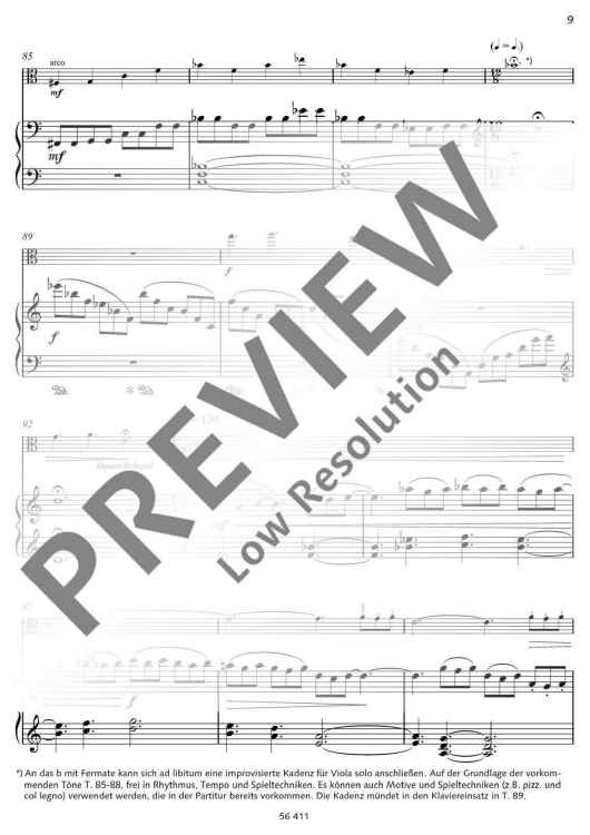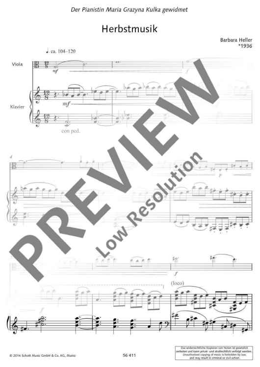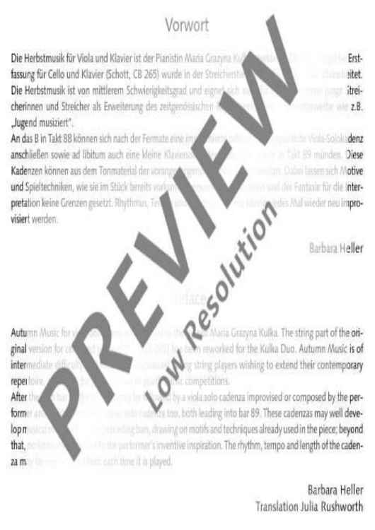 Autumn Music for viola and piano is dedicated to the pianist Maria Grazyna Kulka. The string part of the original version for cello and piano (Schott CB 265) has been reworked for the Kulka Duo. Autumn Music is of intermediate difficulty and suitable for advanced young string players wishing to extend their contemporary repertoire, as well as for performance in youth music competitions. After the Bb in bar 88 the fermata may be followed by a viola solo cadenza improvised or composed by the performer and ad libitum a little piano solo cadenza too, both leading into bar 89. These cadenzas may well develop musical material from the preceding bars, drawing on motifs and techniques already used in the piece; beyond that, no limits should be set to the performer’s inventive inspiration. The rhythm, tempo and length of the cadenza may be improvised afresh each time it is played.
