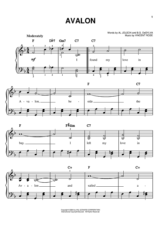 Digital Sheet Music for Avalon by Al Jolson, Django Reinhardt, Vincent Rose, Benny Goodman, Buddy DeSylva scored for Easy Piano; id:373826