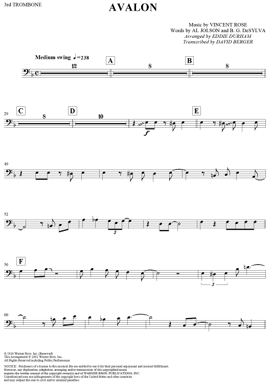 "Avalon - Trombone 3" Sheet Music by Vincent Rose