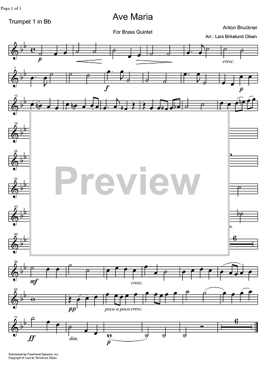 Digital Sheet Music for Ave Maria - B-flat Trumpet 1 by , Anton Bruckner, Lars M. Birkelund Olsen scored for Brass Quintet; id:329699