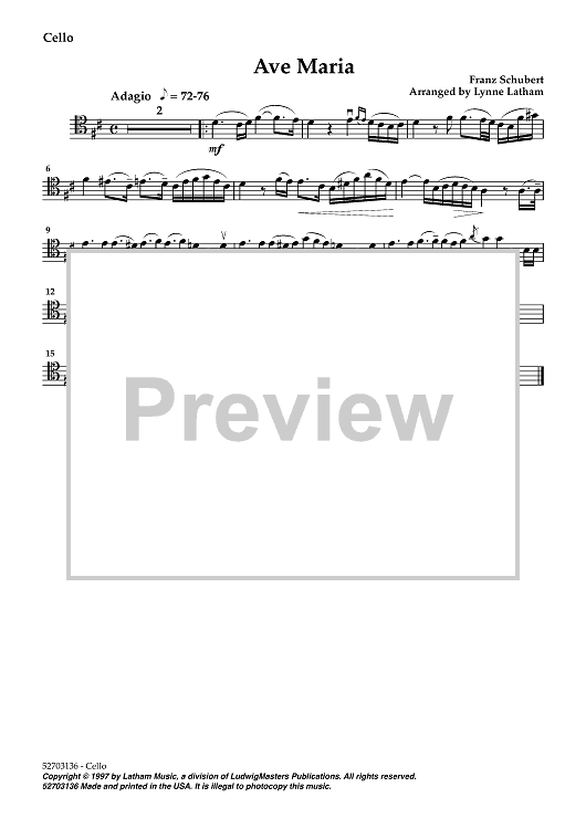 Digital Sheet Music for Ave Maria - Cello by , Franz Schubert, Lynne Latham scored for String Quartet; id:449687