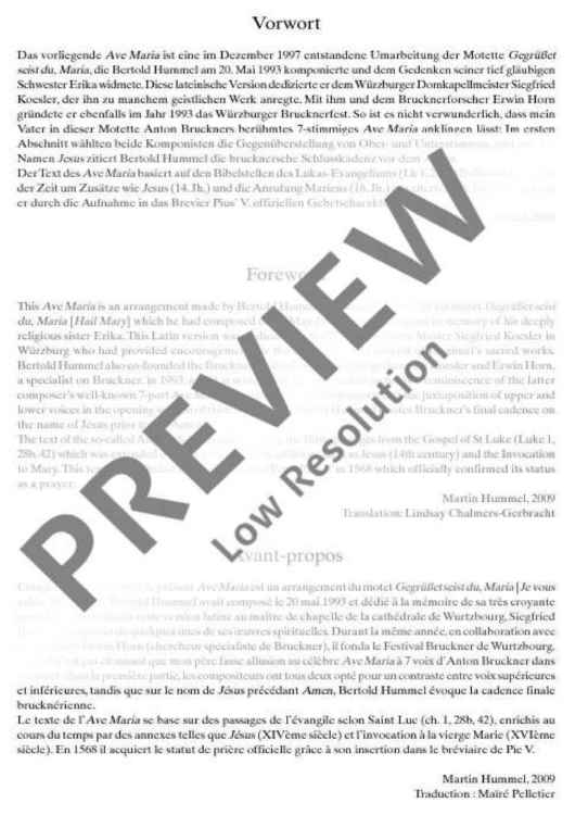 This "Ave Maria" is an arrangement made by Bertold Hummel in December 1997 of his motet "Gegrüßet seist du, Maria [Hail Maria]" (C 53714) which he had composed on 20 May 1993 with a dedication in memory of his deeply religioues sister Erika. This Latin version was dedicated to the Cathedral Music Master Siegfried Koesler in Berold Hummel also co-founded the Bruckner Festival in Würzburg together with Koesler and Erwin Horn, a specialist in the opening section of their sorks and Bertold Humme quotes Bruckner's final cadence on the name of Jesus prios to the Amen. The text of the so-called Angelic Salutaion is based on the Bible passages from the Gospel of St Luke (luke 1, 28b, 42) which was extended over the centuries with additions such as Jesus (14th century) and the Invocation to Mary. This text was included in the Breviary of Pope Pius V in 1568 which officially confirmed its status as a prayer.
